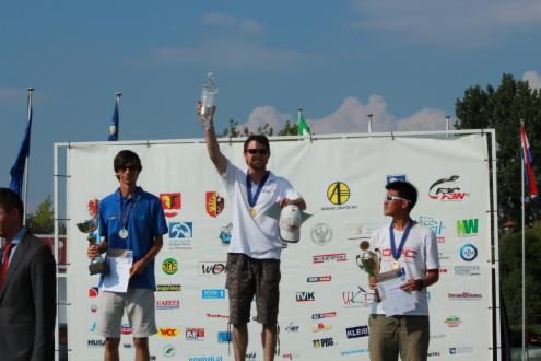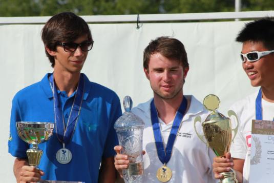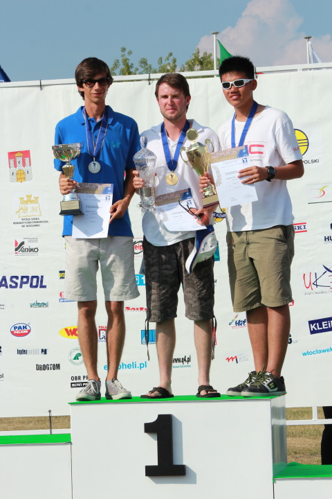 das gesamte WM-Team und die Piloten mit ihrem Fluggerät Eric´s Wettbewerbshelizwischen den Flügen beim relaxen. So überreicht man Pokale :-) die drei auf dem Treppchen bei F3N